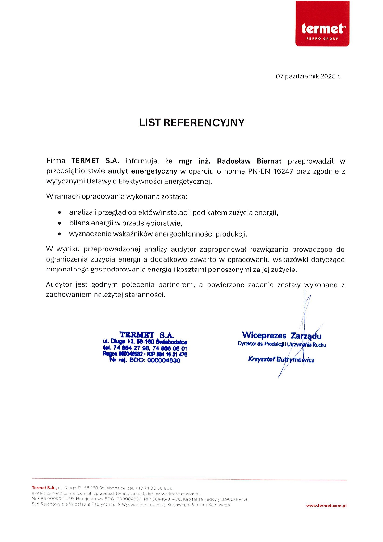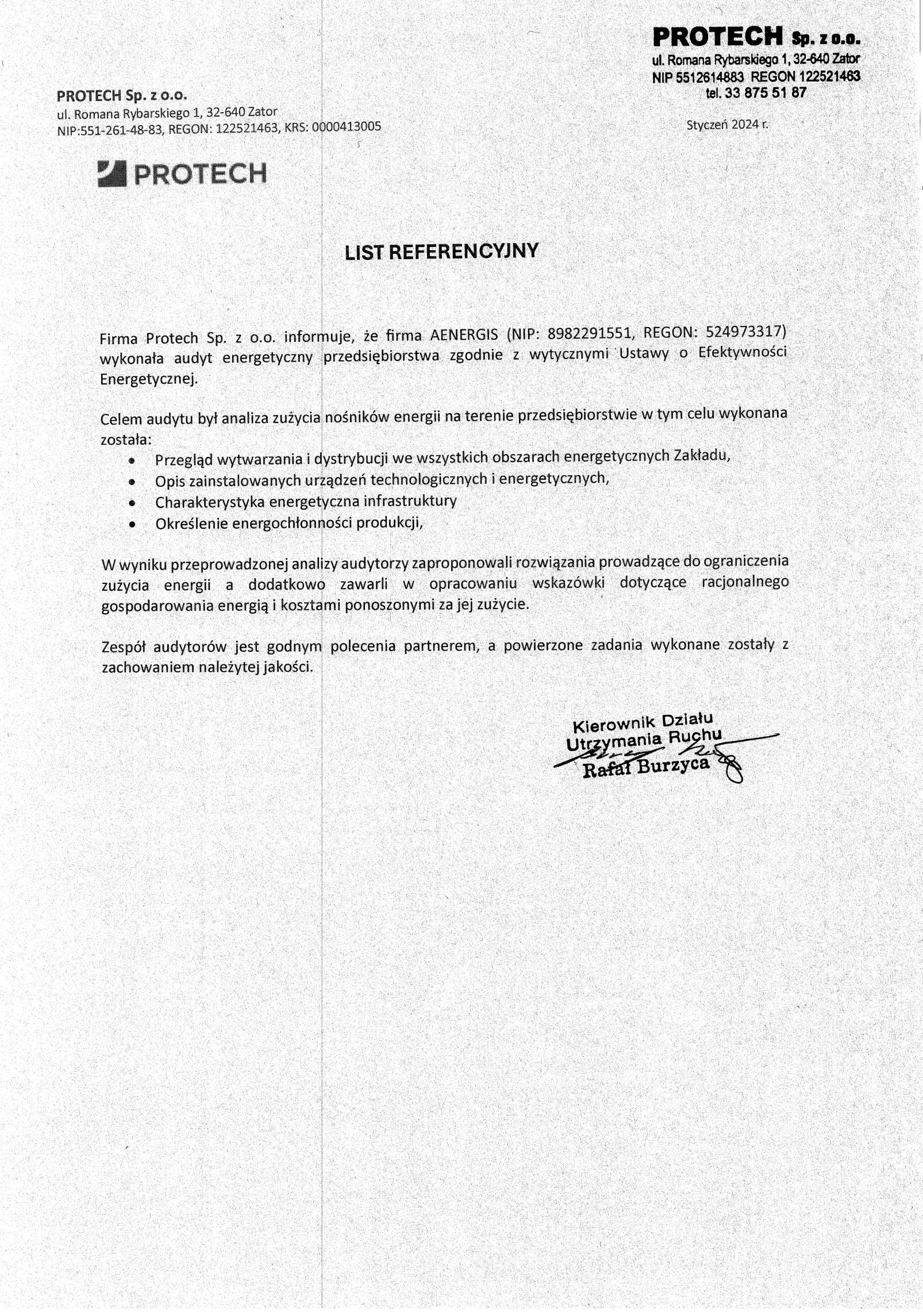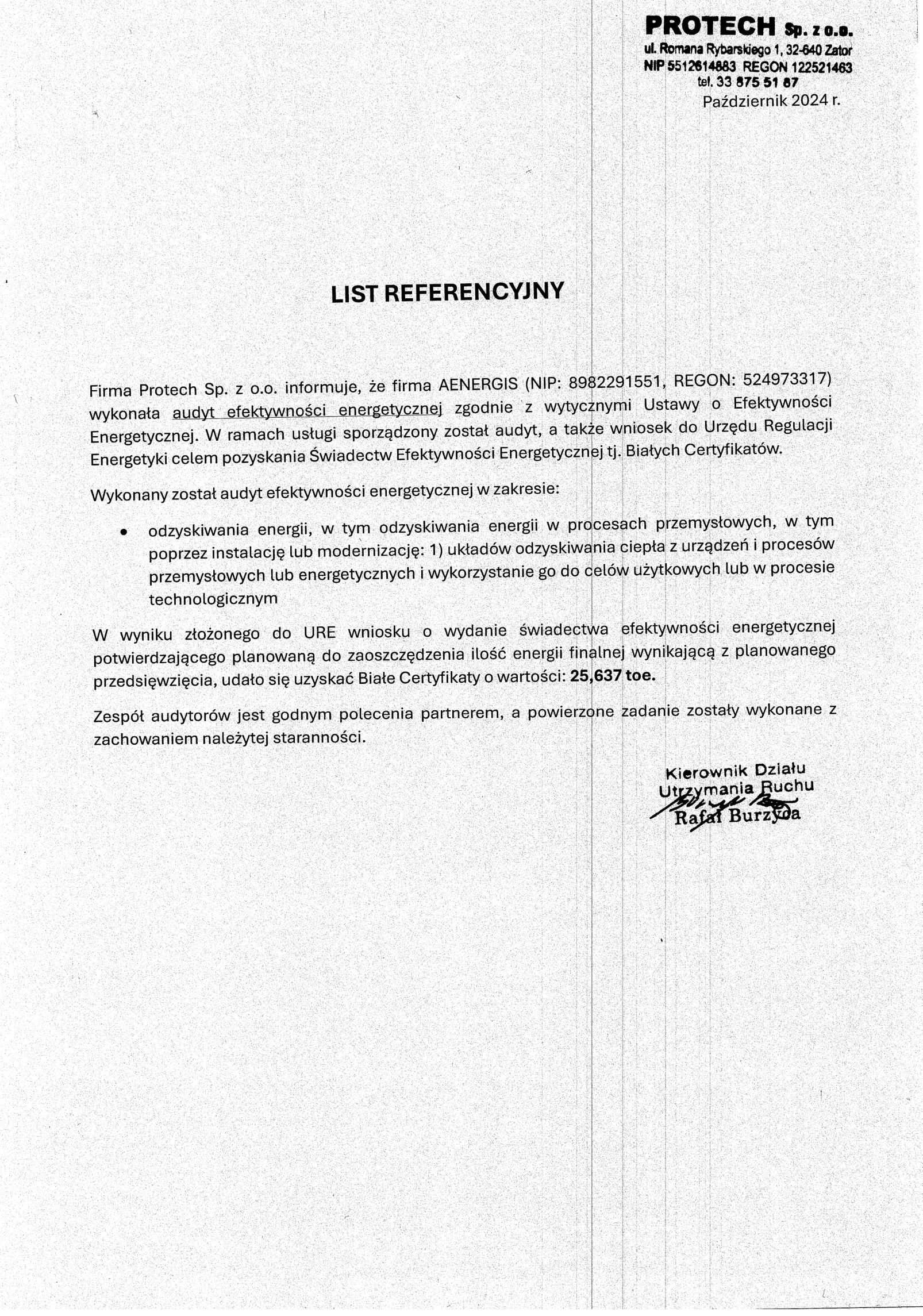 Audyt przedsiębiorstwa → wynika z zapisów Ustawy o Efektywności Energetycznej. Jego głównym celem jest identyfikacja energochłonnych obszarów przedsiębiorstwa wraz z propozycją inicjatyw zmniejszających zużycie energii.