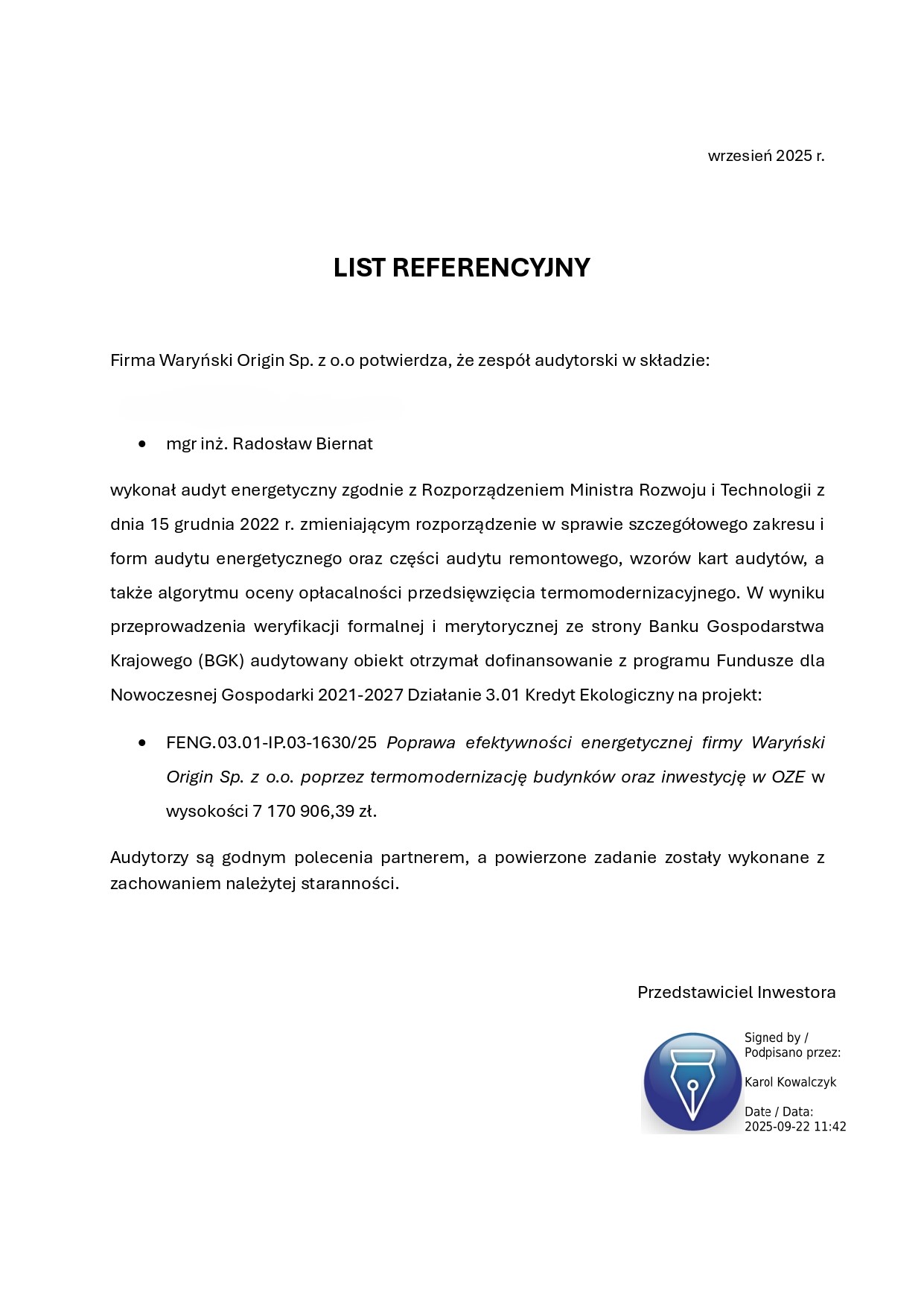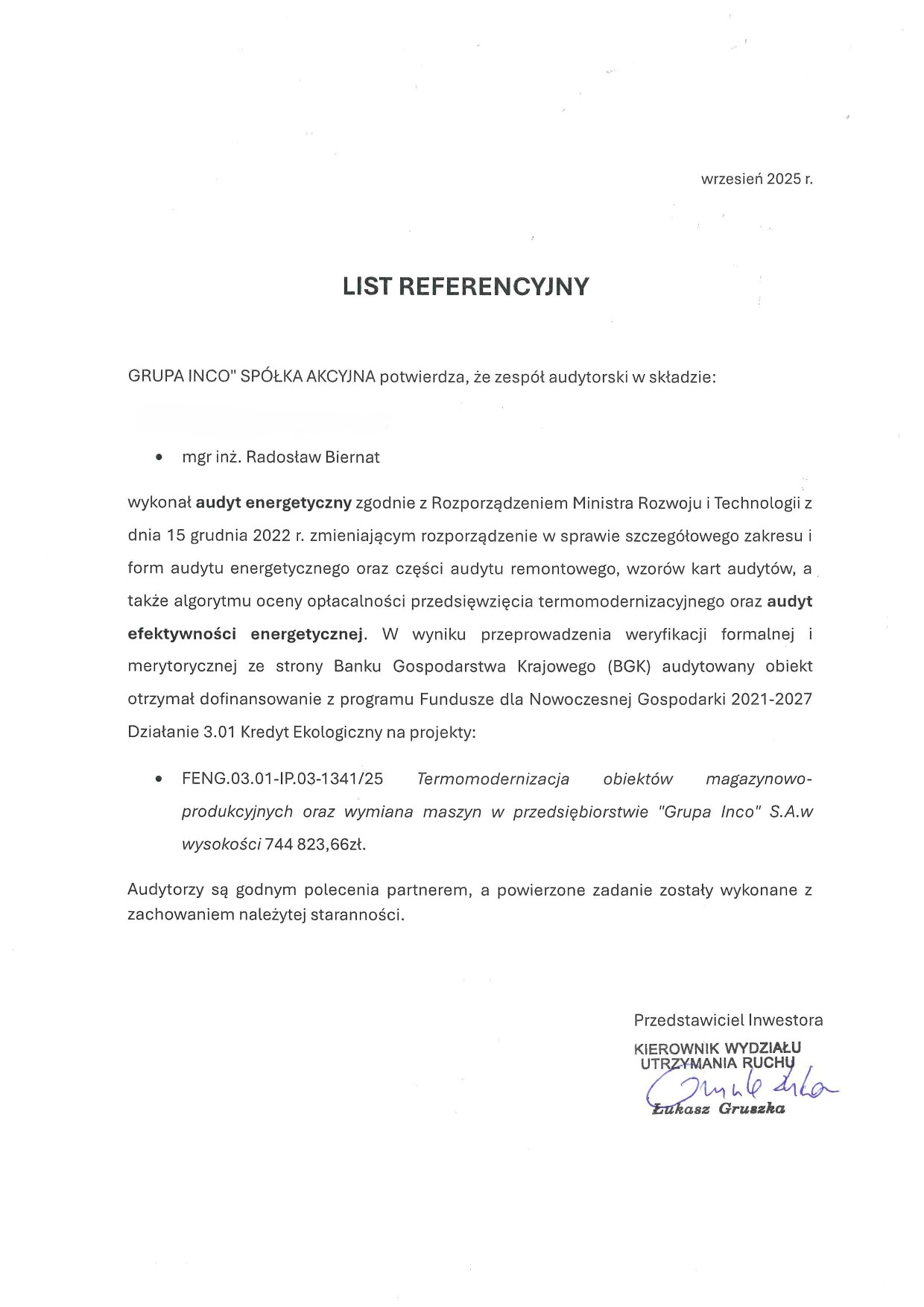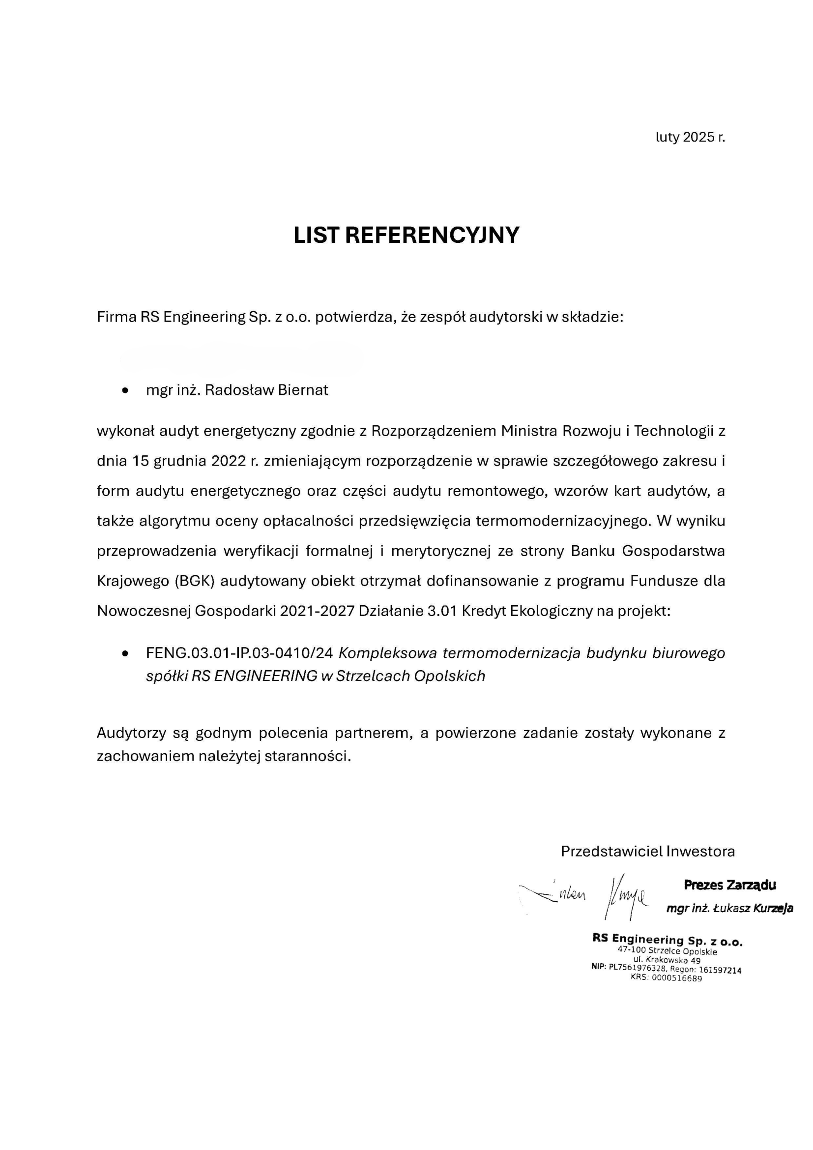 Kredyt ekologiczny → dokumentacja audytowa do działania 3.1 FENG proponowanego przez Bank Gospodarstwa Krajowego