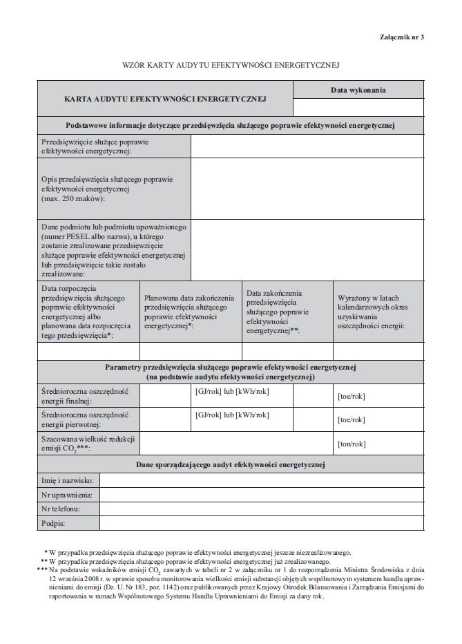 Audyt efektywności energetycznej obejmuje opis przedsięwzięcia, charakterystykę stanu istniejącego, założenia przyjęte do obliczeń oraz wyznaczenie oszczędności energii uzyskiwanej w wyniku realizacji przedsięwzięcia. Zakres opracowania zależy od rodzaju modernizacji, jednak co do zasady powinien pozwalać na jednoznaczne określenie granic przedsięwzięcia, warunków pracy instalacji lub procesu oraz sposobu wyznaczenia efektu energetycznego.